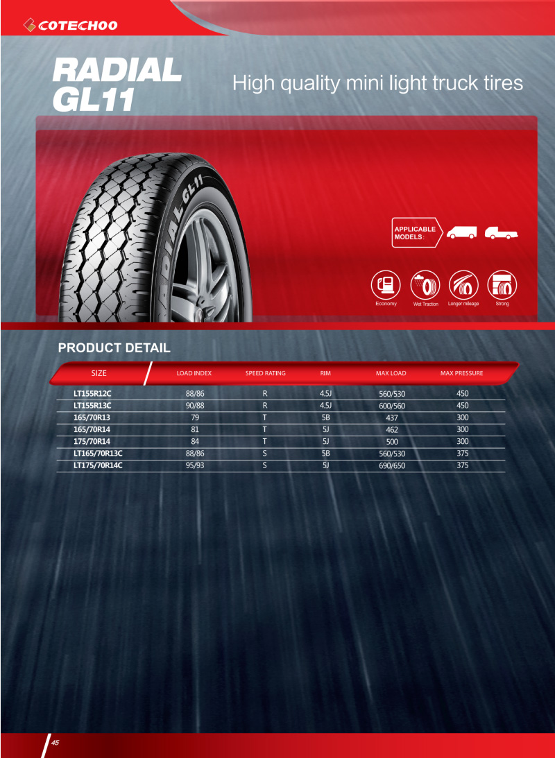 RADIAL GL11 精品輕載輪胎,高強胎體結構,承載力更強,耐磨橡膠配方和加深花紋,更高的使用壽命。