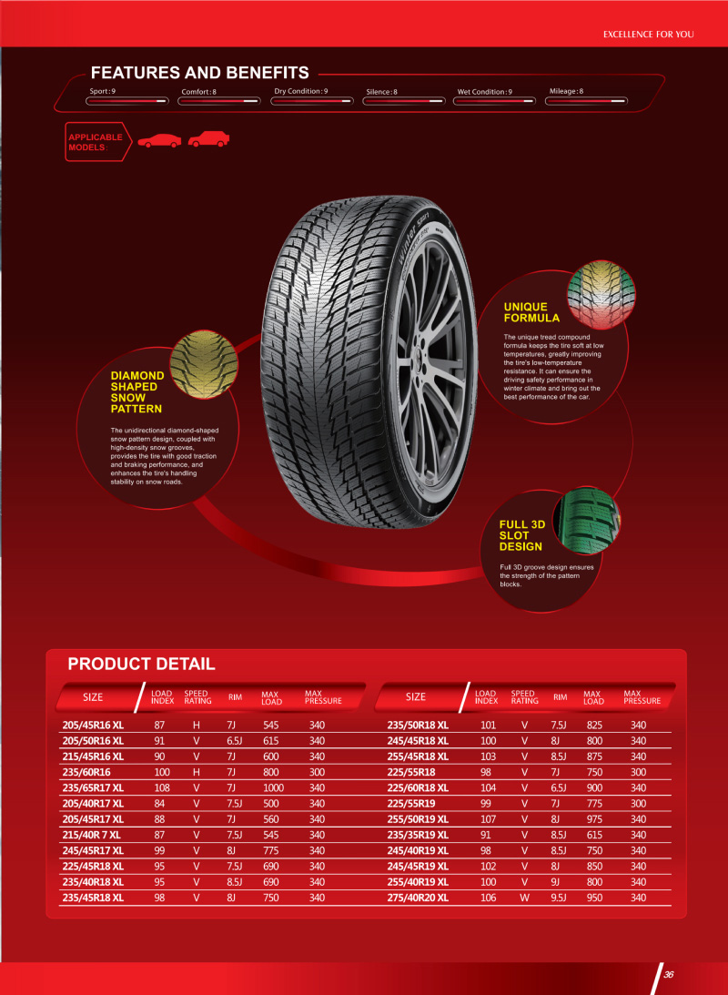 WINTER SPORT 獨特胎面膠料配方及花紋,為輪胎提供良好的牽引力和制動(dòng)性能,可保證在冬季氣候下的駕駛安全性能。